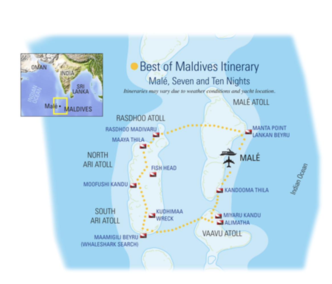 The expedition begins and ends in Malé, Maldives.